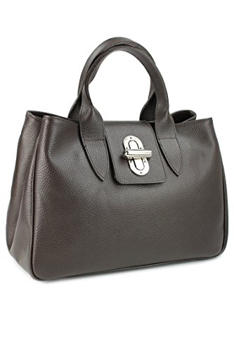 High quality leather bag made in italy. Available in a lot of colours and embossings in our shop. Great modern look - strong, stable and high quality genuine leather - silver coloured metal elements. Reinforced bottom with metall feets. The ideal companion for every day in a handy format. Variable used as a tote bag or shoulder bag with the separate shoulder strap. - All our leather bags are impregnated as a small service performance for you before shipping fresh. - All customer orders are processed and fulfilled by Amazon and the goods will be shipped directly from Amazon to you. Details of the bag: - Freshly impregnated - 3-divided main compartment with center zipper compartment + 1 pocket inside with zipper, one pocket for handy - Separate shoulder strap - 2 variants carrying handle or shoulder bag - With a zipper and extra twist lock to close - Dimensions approximately: Width: 36,5 cm Height: 24 cm (without handles) Depth: 18 cm